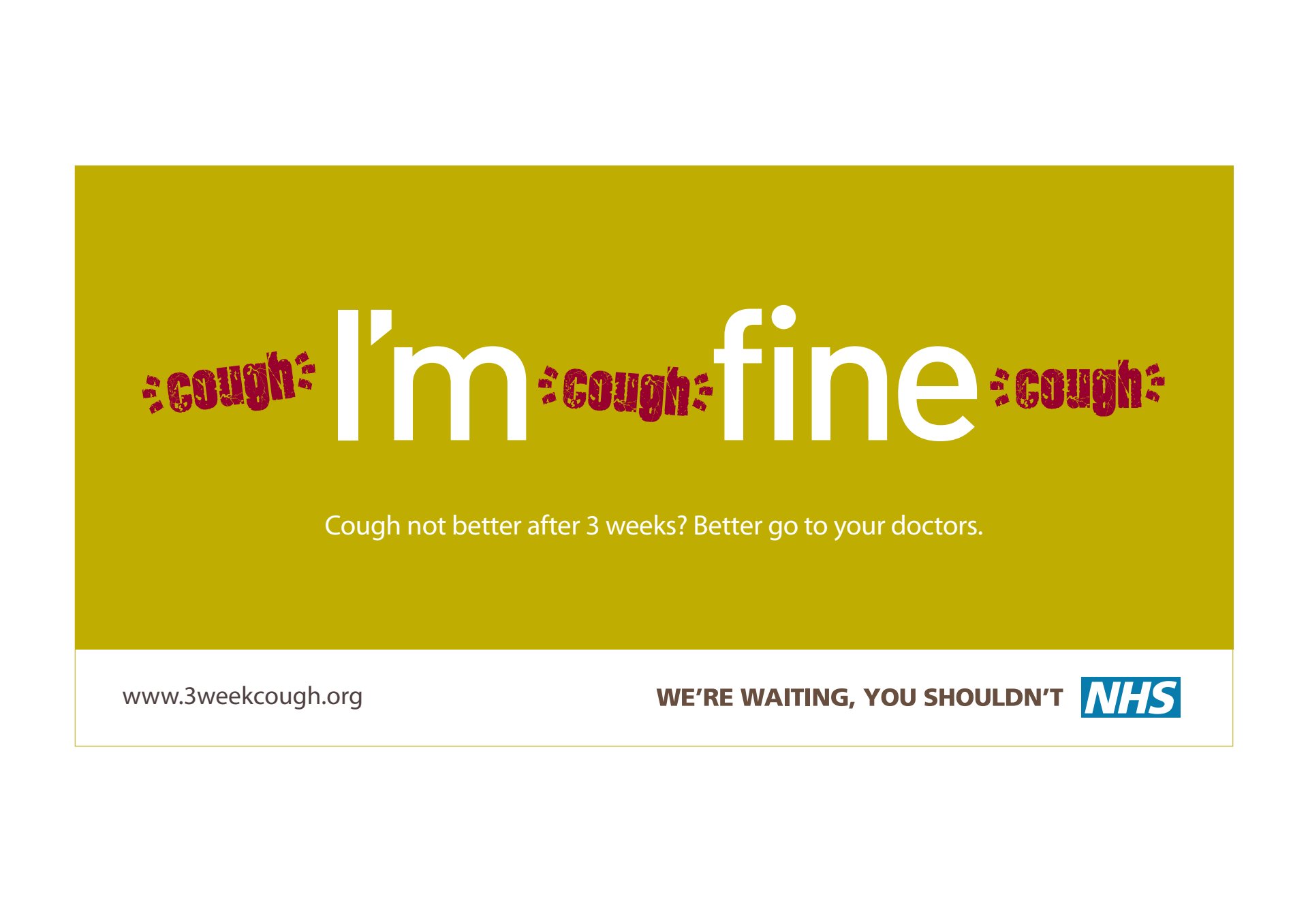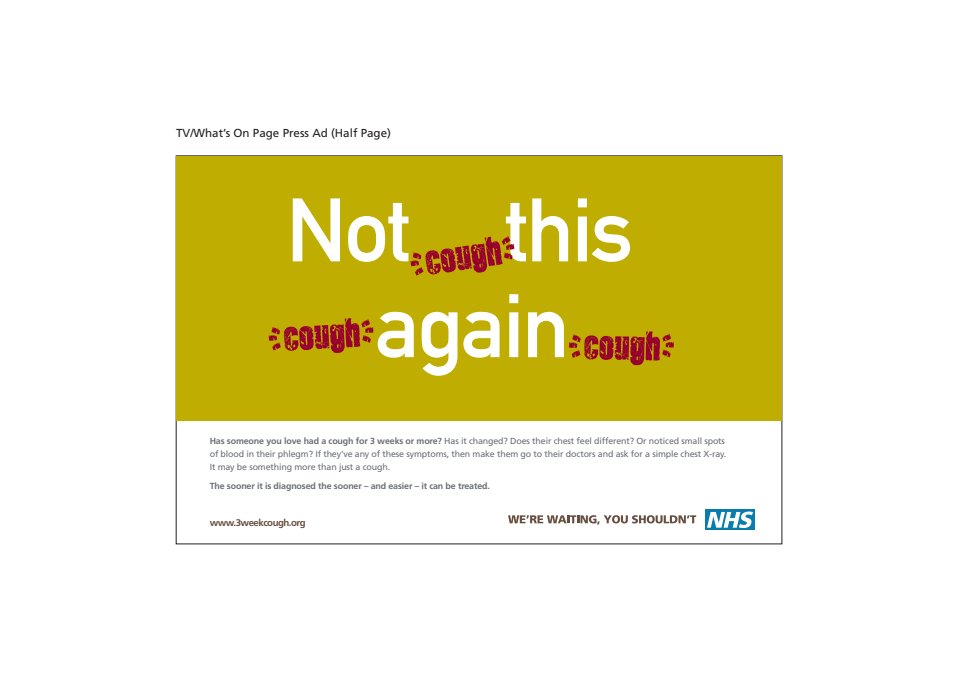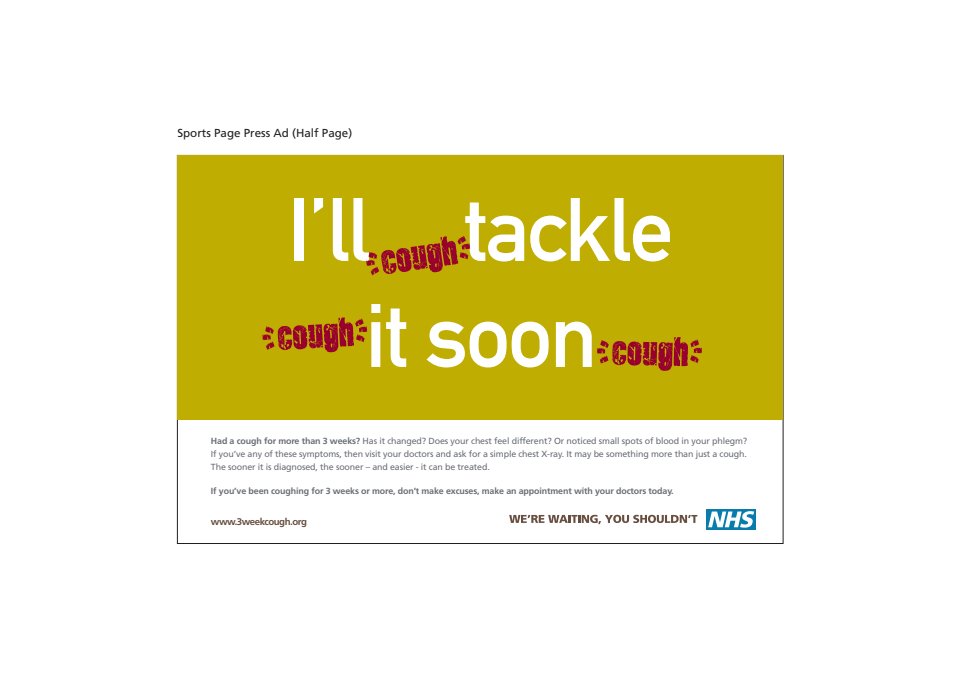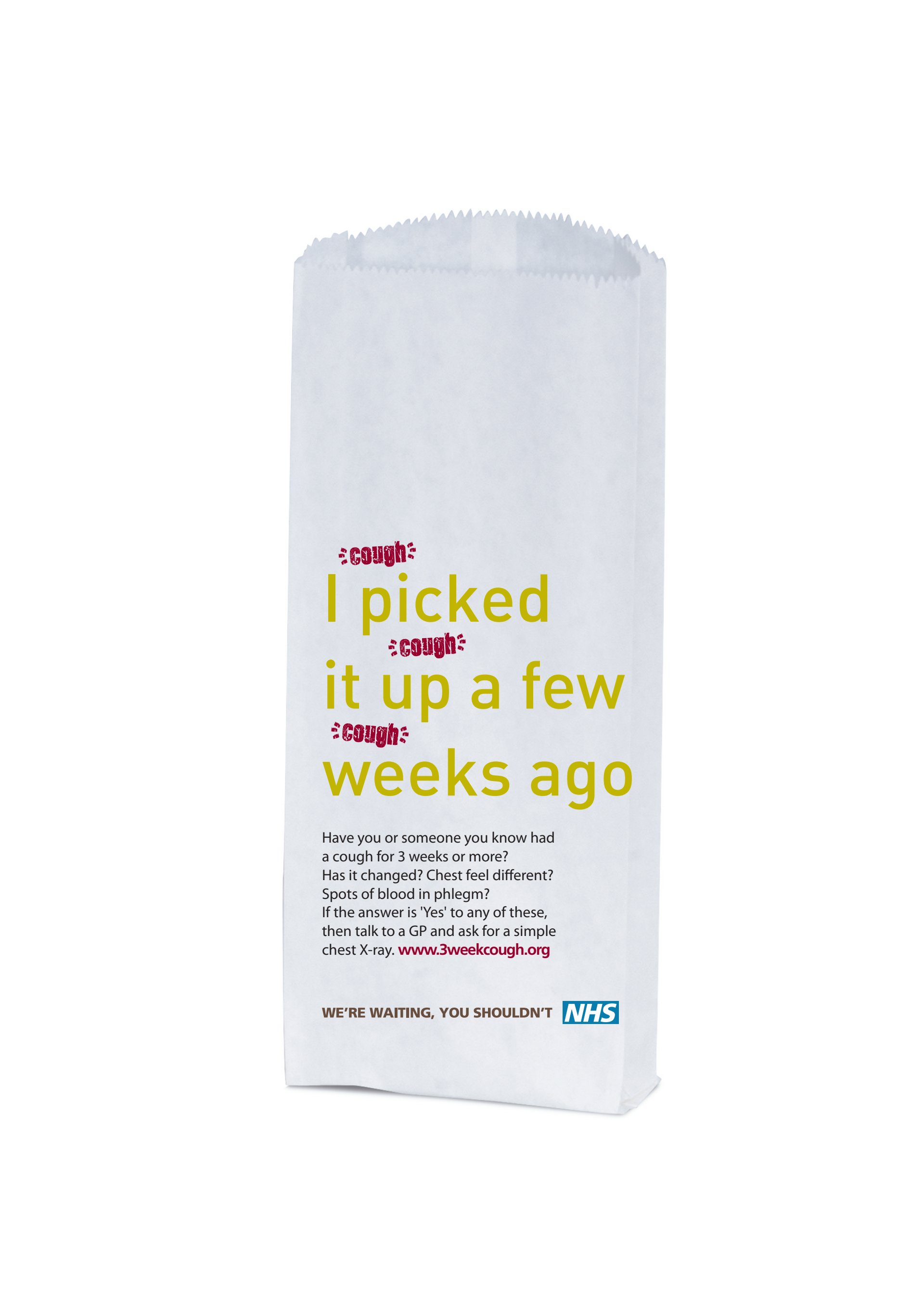 This regional NHS campaign makes it nice and clear that if you’ve been coughing for a few weeks you need to get to the docs. As you’ll see it could be tailored to different mediums without losing any of its impact. The pharmacy bag one went on to win an award. The one below is a mock-up. I never did get a copy of the finished thing!